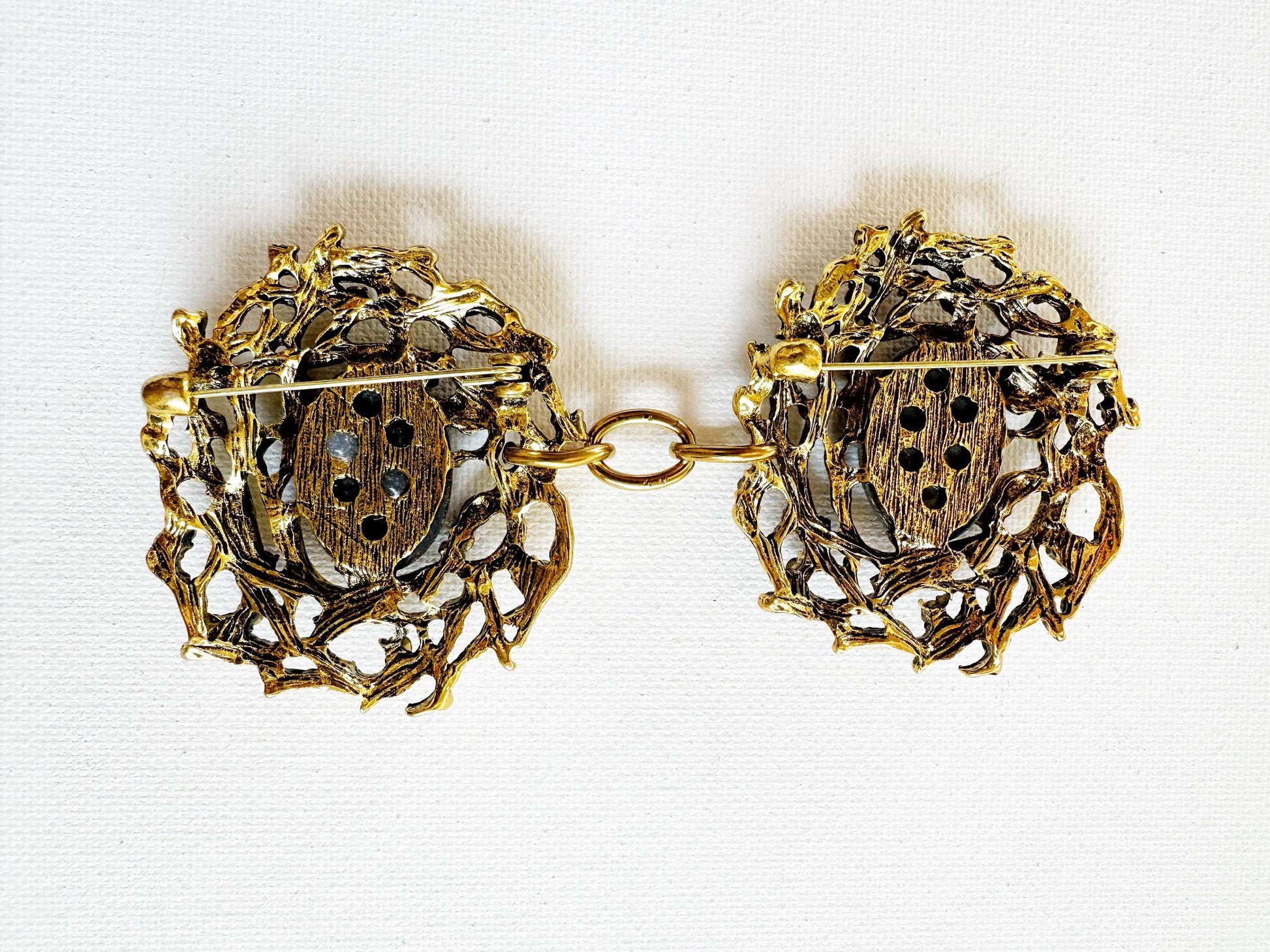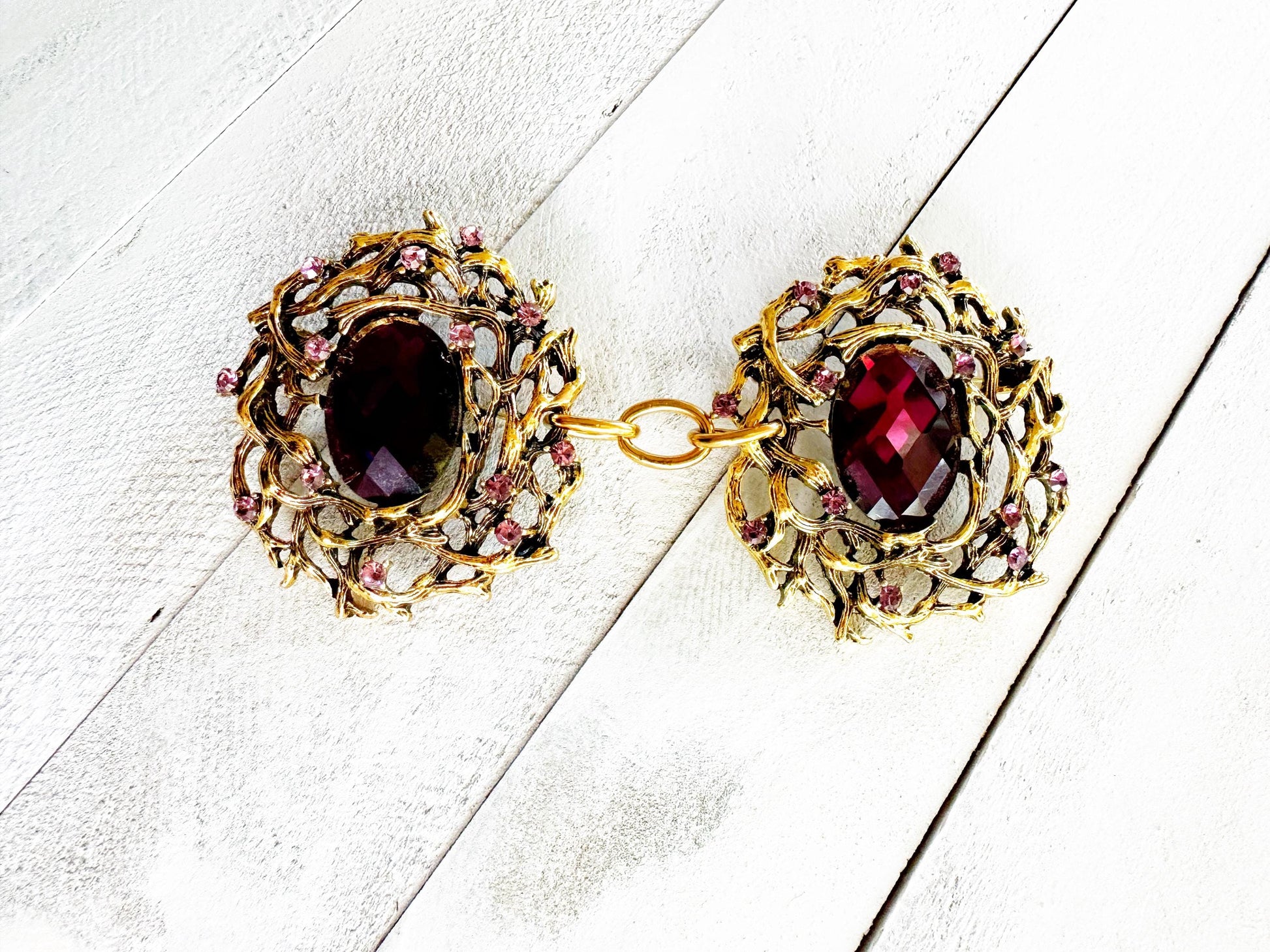 Each Brooch features large multi-faceted center "stones", surrounded by gold-toned twigs with intricate etching, and dozens of tiny purple rhinestones inlaid throughout. 2.25" x 1.75" each