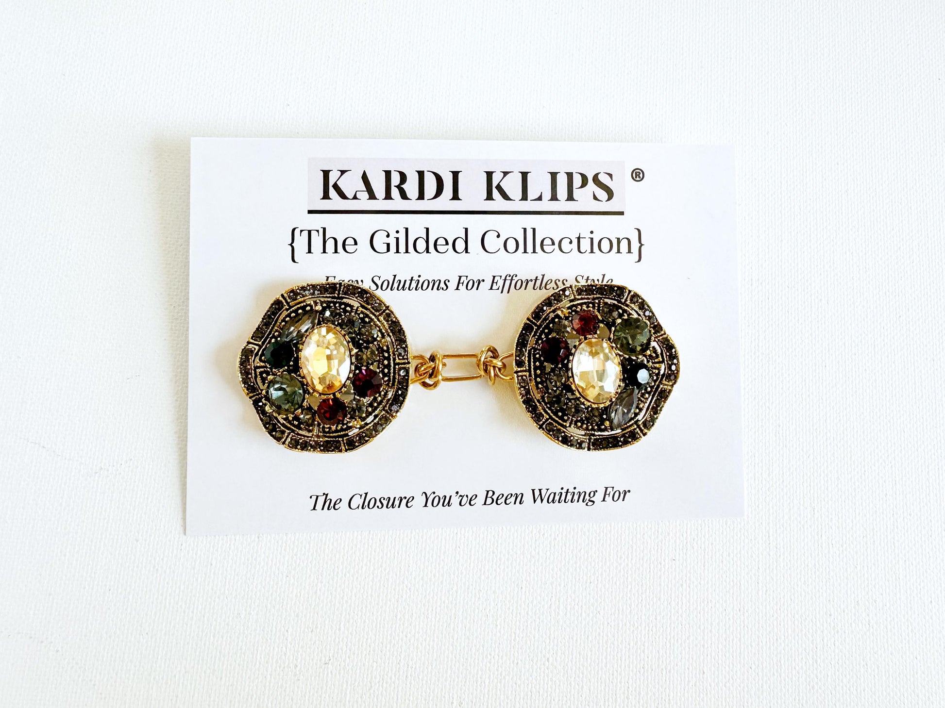 Bejeweled Gold Baroque Cinch Clip | Cardigan and Sweater Clips | Scarf Clasp Brooches for Dress Belt | Unique Handmade USA Gift | KardiKlip