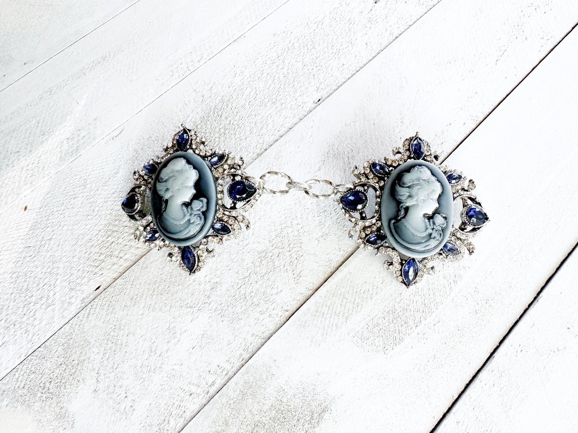 Blue Silver Cameo Cloak Clasp, Costume Cameo Brooch w/ Rhinestones | Victorian Fairytale Closure, Gothic Edwardian Adult Costume Accessories