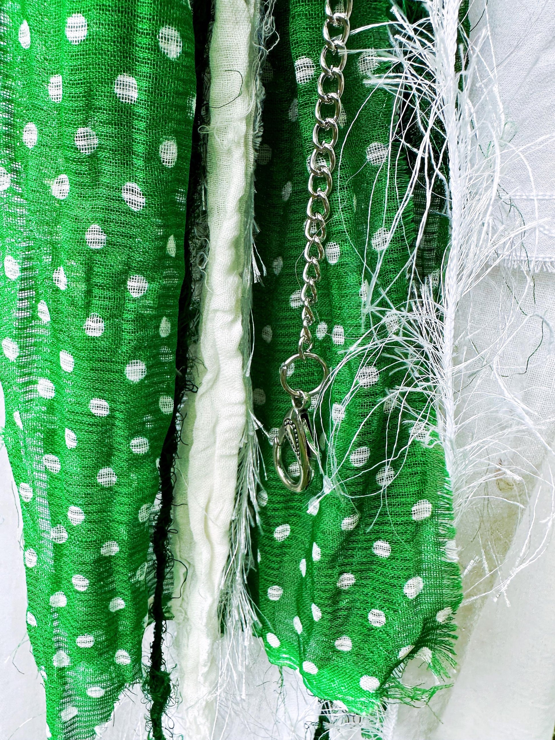 Chatelaine Belt Sash | Green & White, Silver Flowers OOAK Accessory with Hooks, Clips, Clasps | Reclaimed Materials, Silk, Linen, Fiber Art