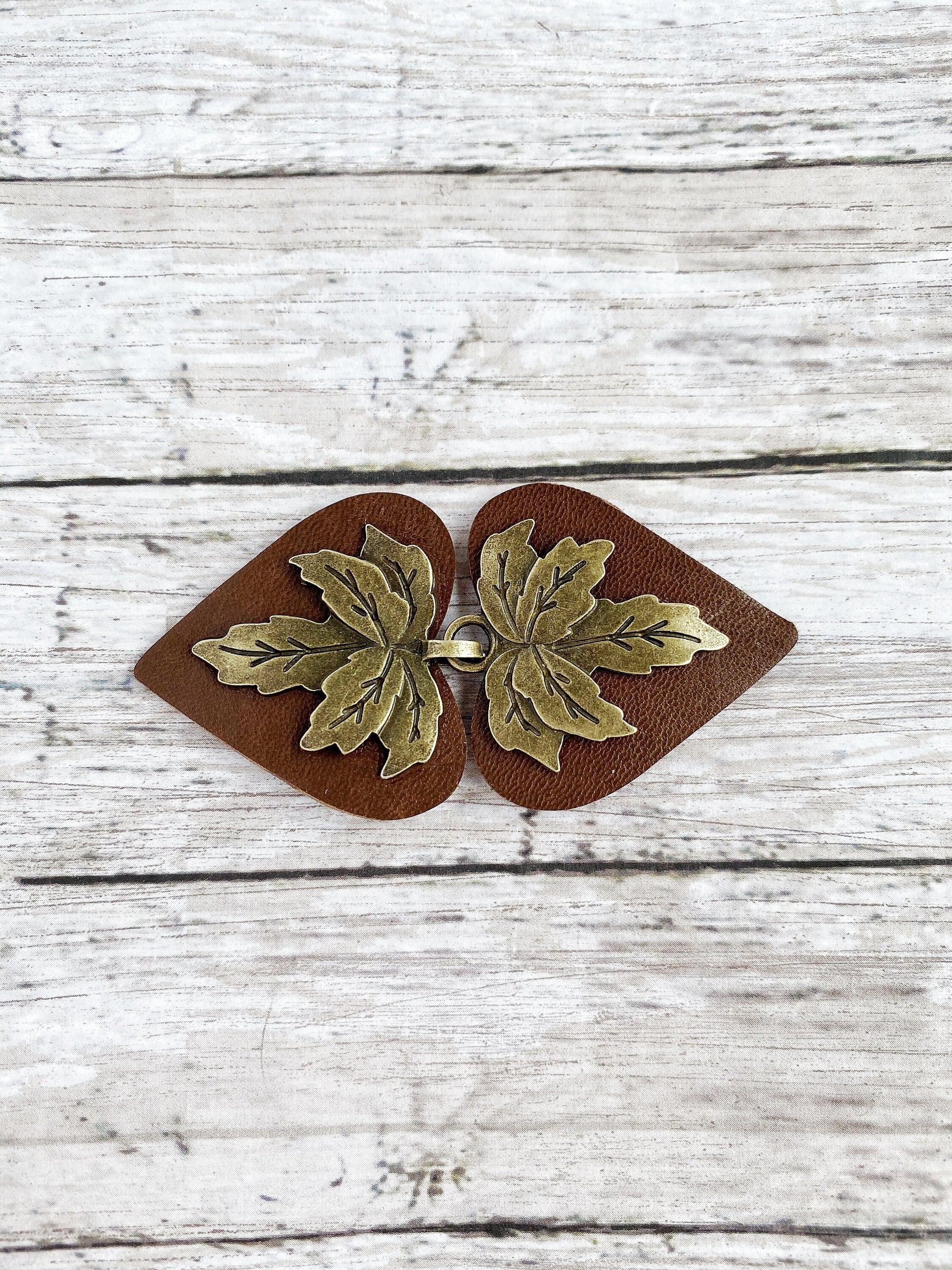 "Halcyon" Bronze Metal Leaf on Brown Leather Clothing Clasp