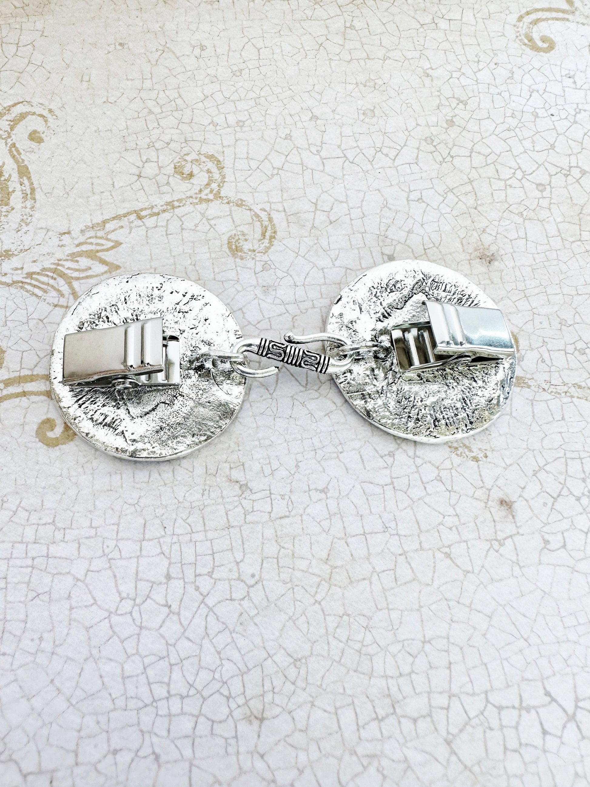 Featuring two hammered discs with a center spiral pattern connected by a detailed S Hook, these medallions are easy to fasten and provide a secure attachment to your cloak or costume.