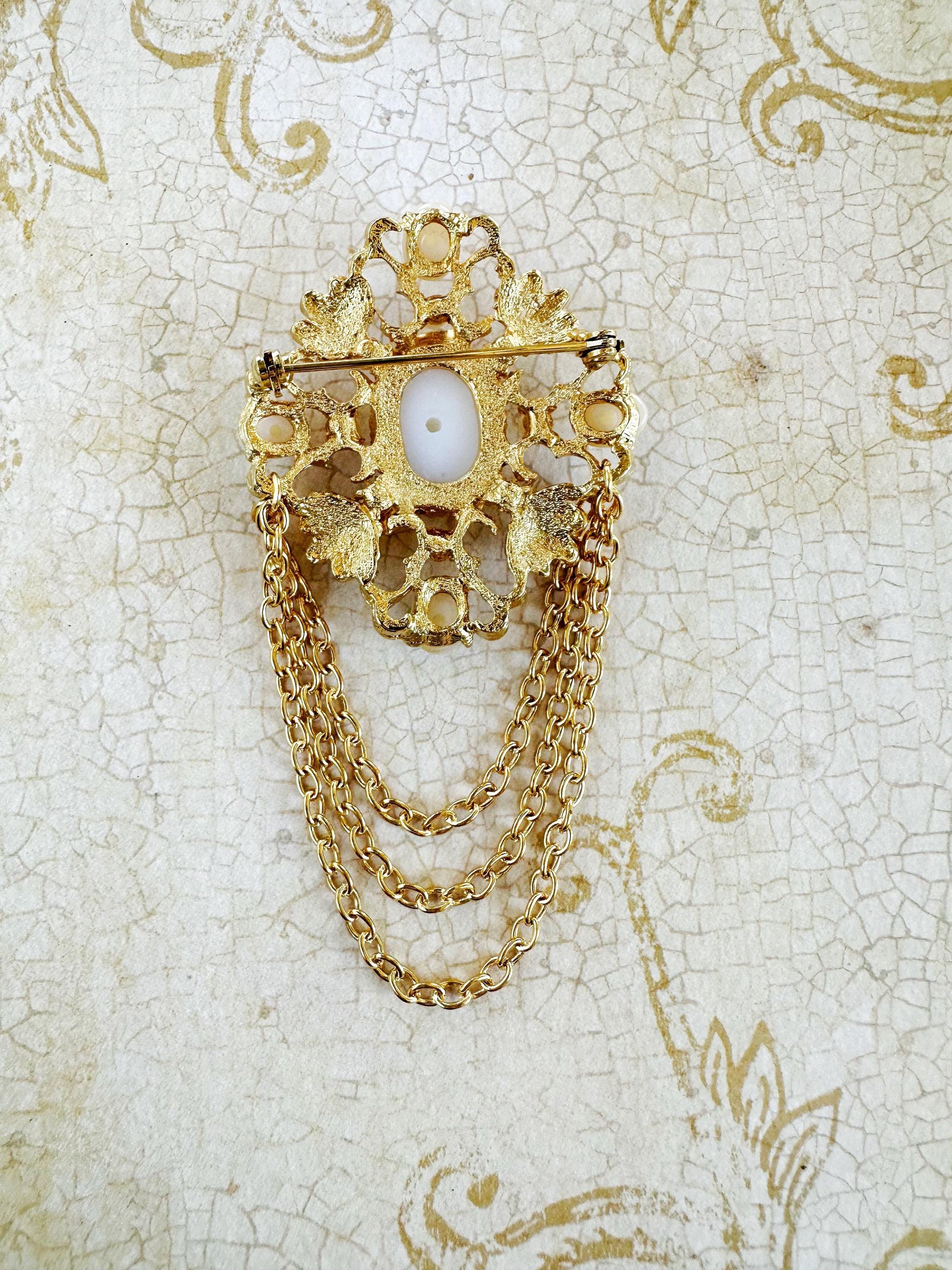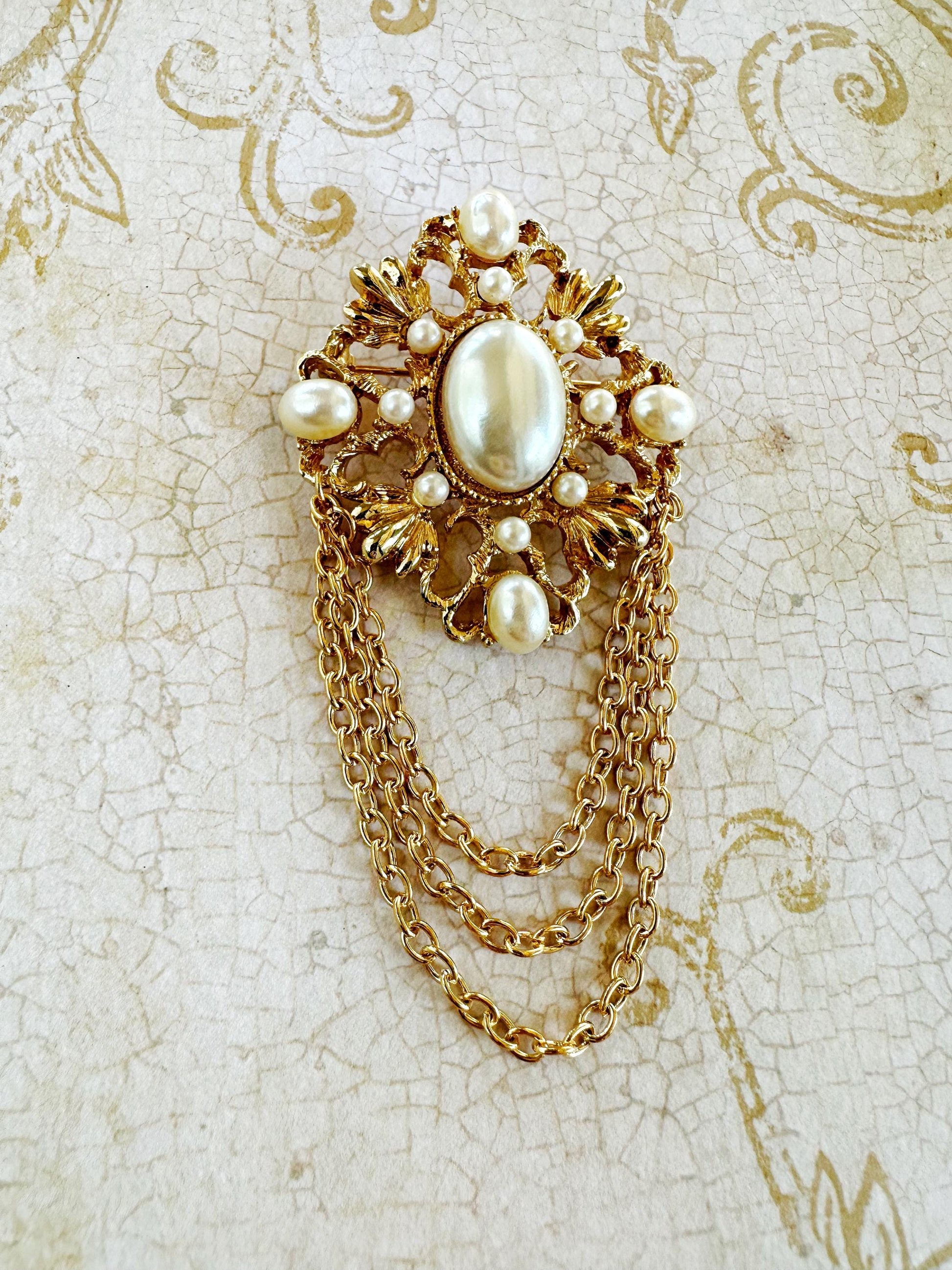 Lovely Vintage Gold-toned with Inset Faux Pearls Pin w/ Triple Draping Chains.