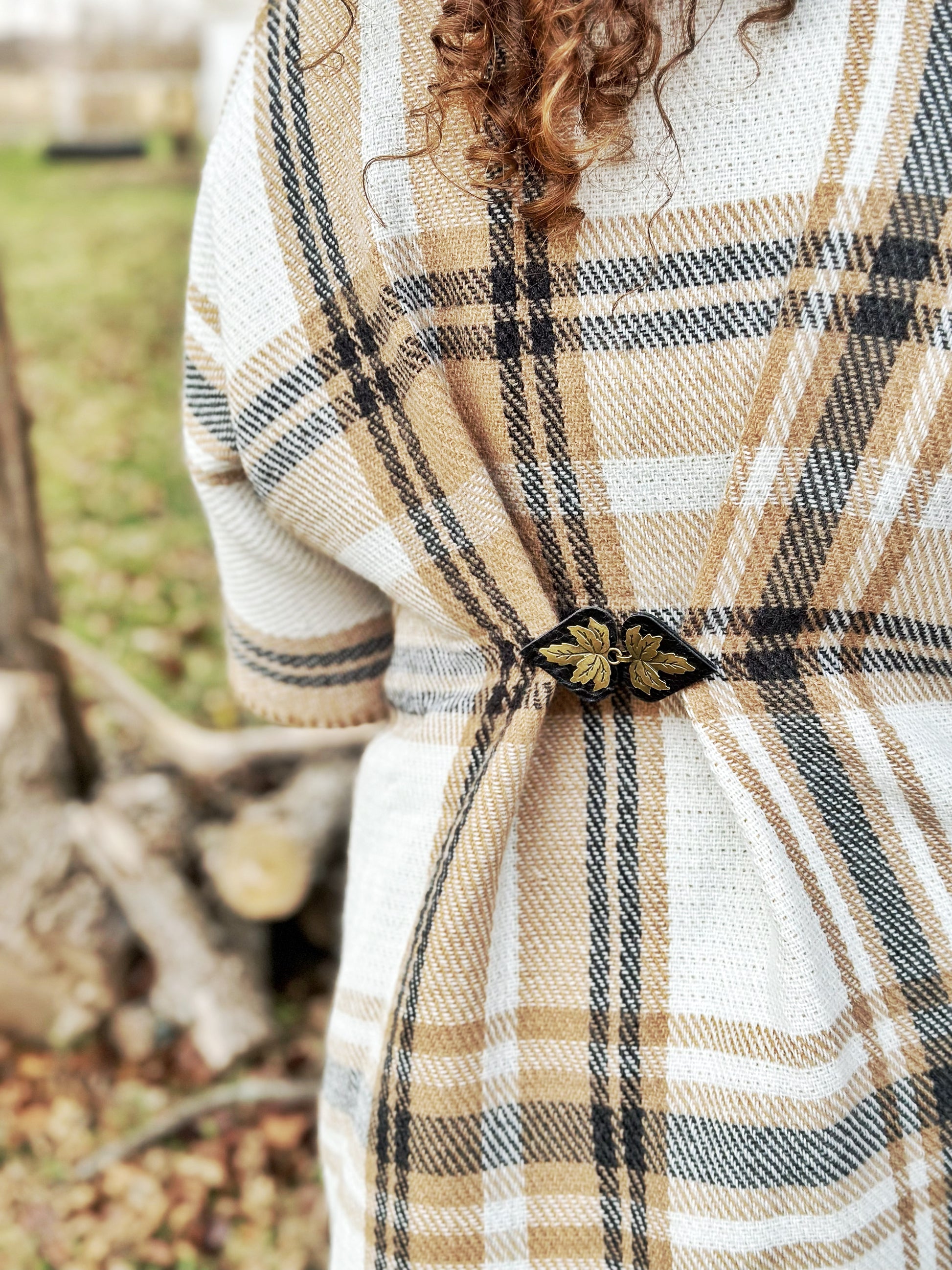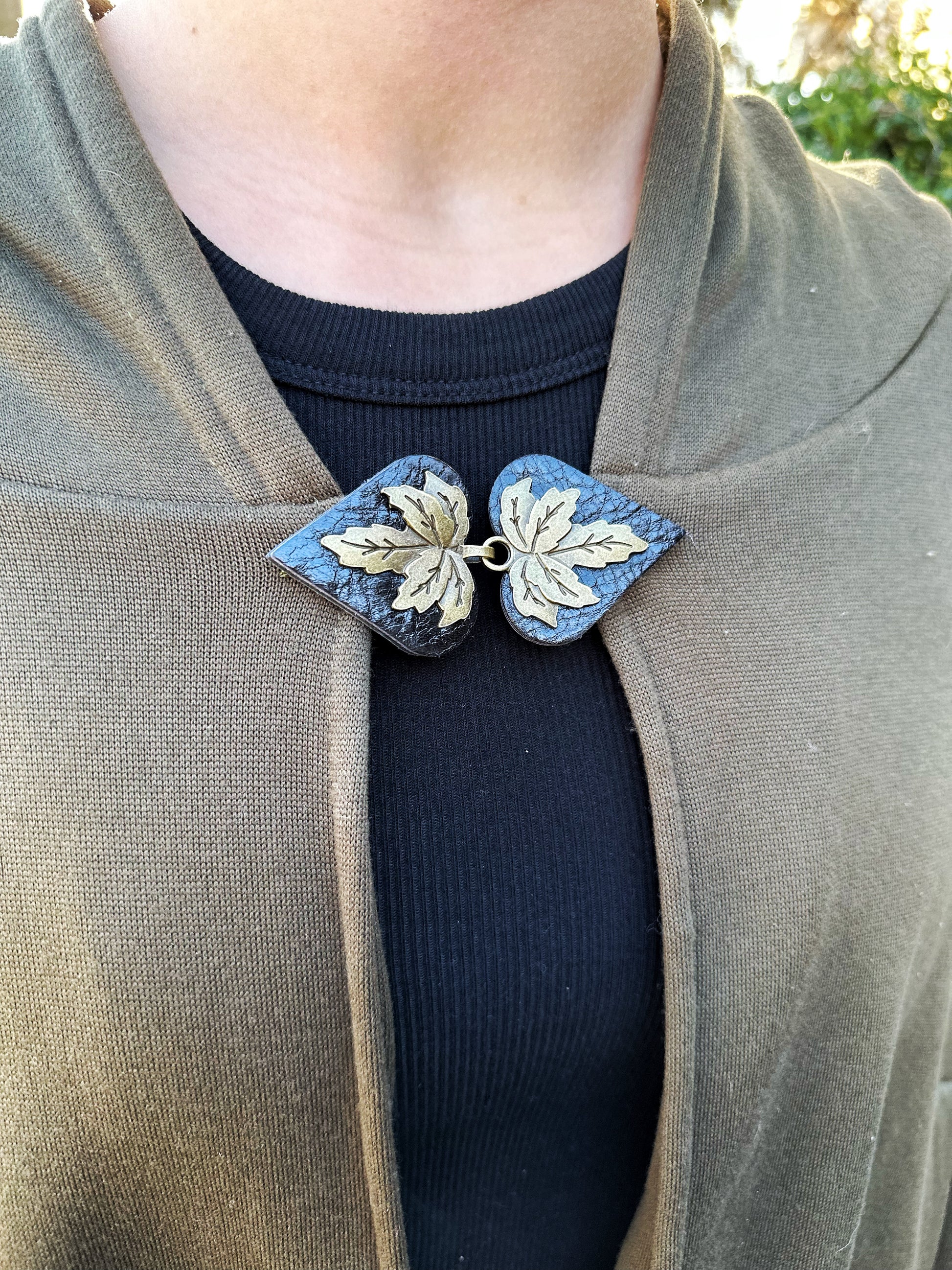 "Halcyon" Bronze Metal Leaf on Black Leather Clothing Clasp