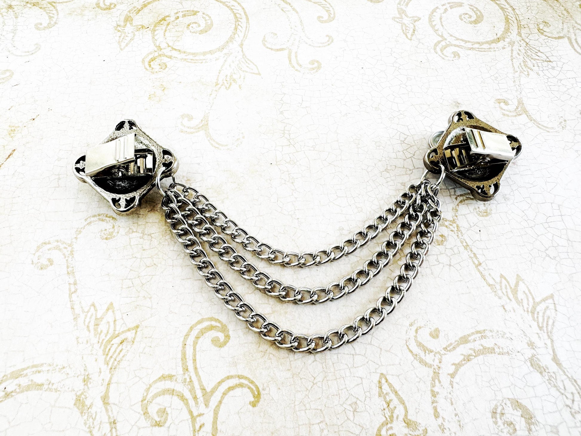 These gorgeous studs were found in an estate sale and lovingly restored and repurposed with new back clips and added chains, given new life as a beautiful, truly one-of-a-kind cloak clasp and costume fastener.