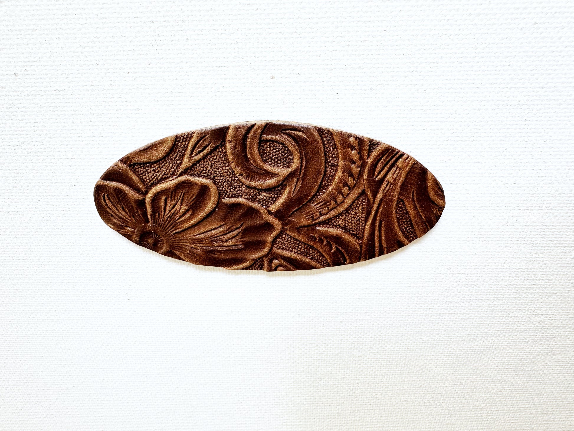 "Impressions" - Rich, chocolate brown oblong leather imprinted with a raised floral & leaf pattern.
