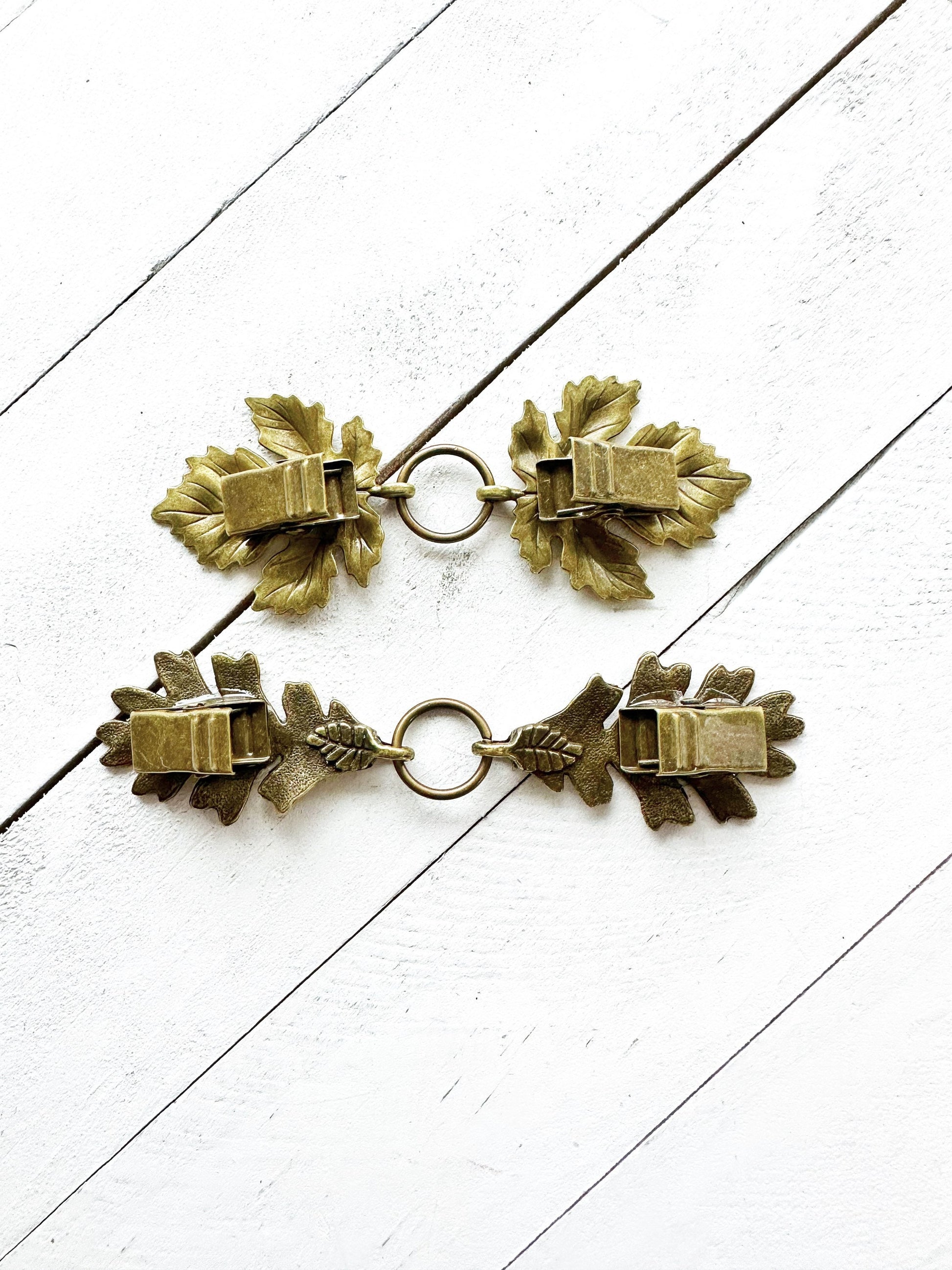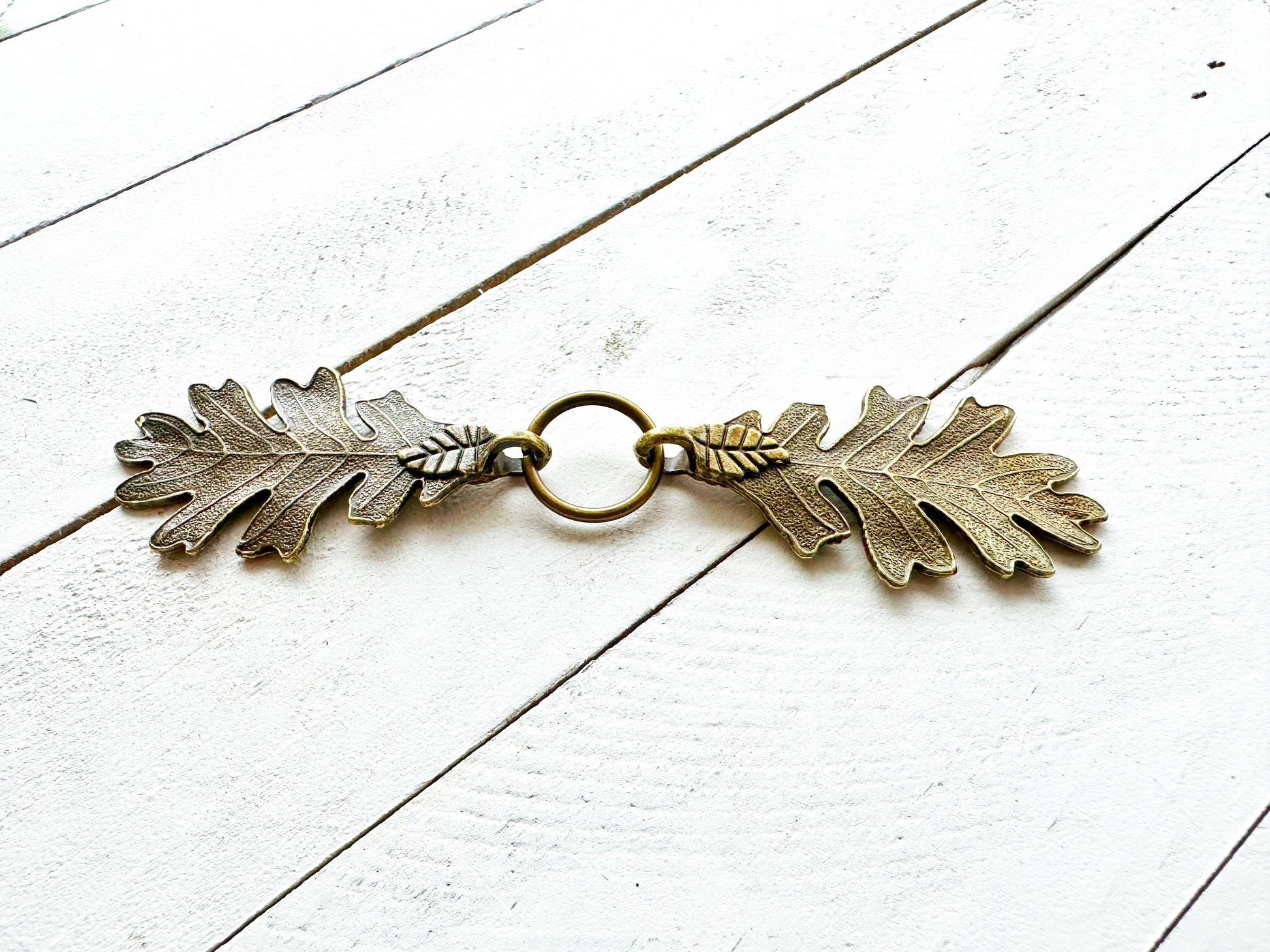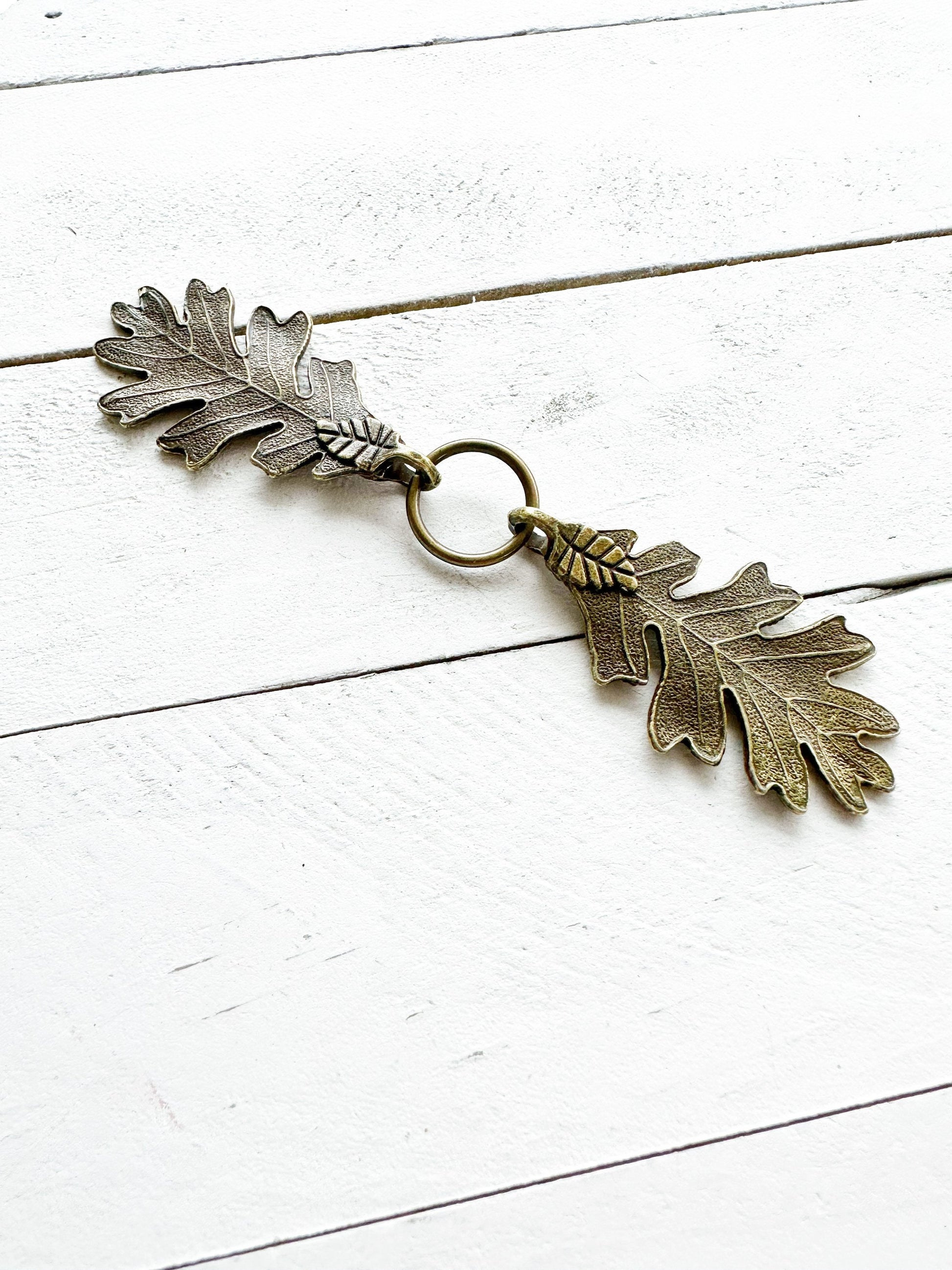 Double antique-bronze metal oak leaves connected by a center o-ring.