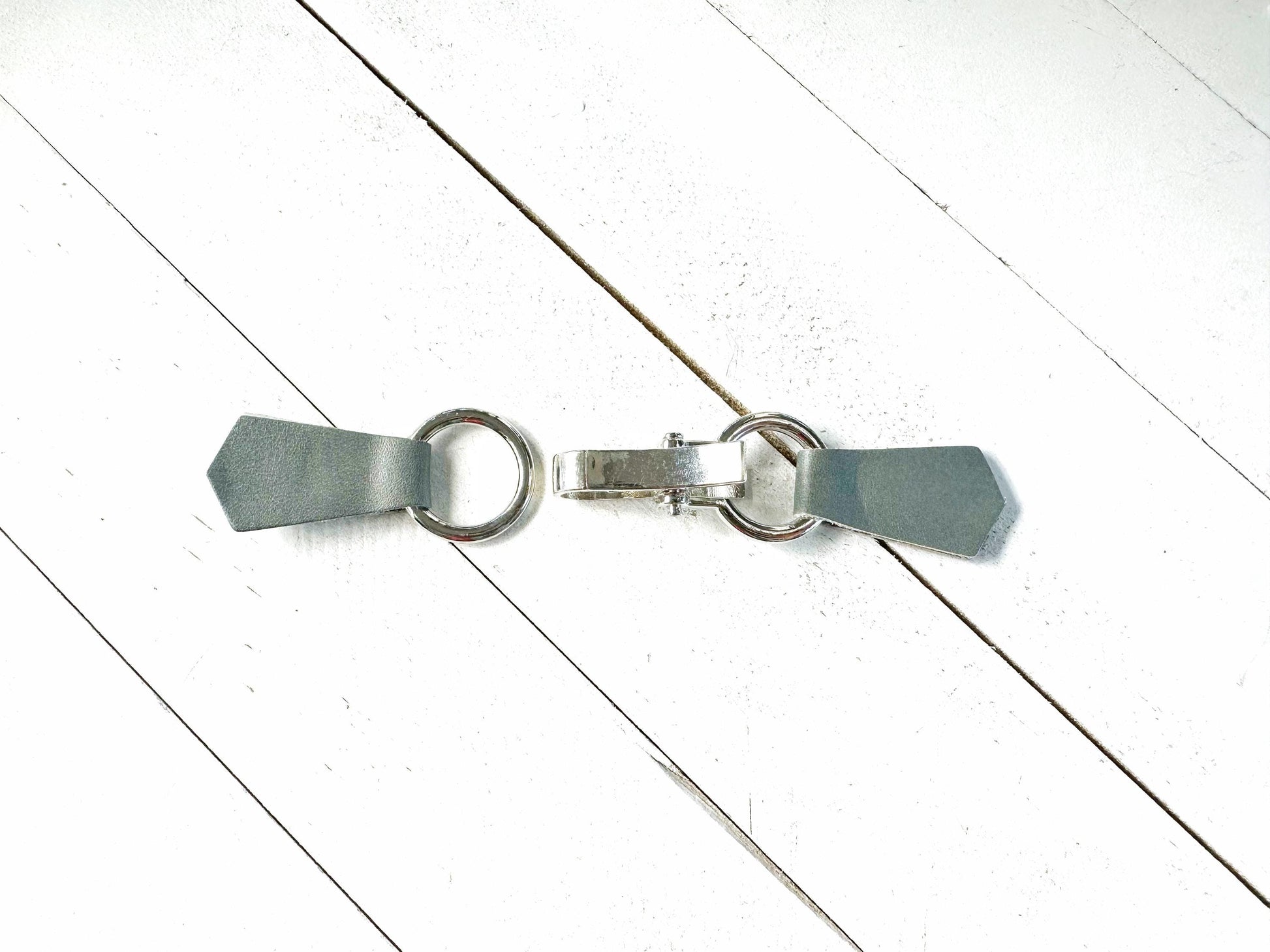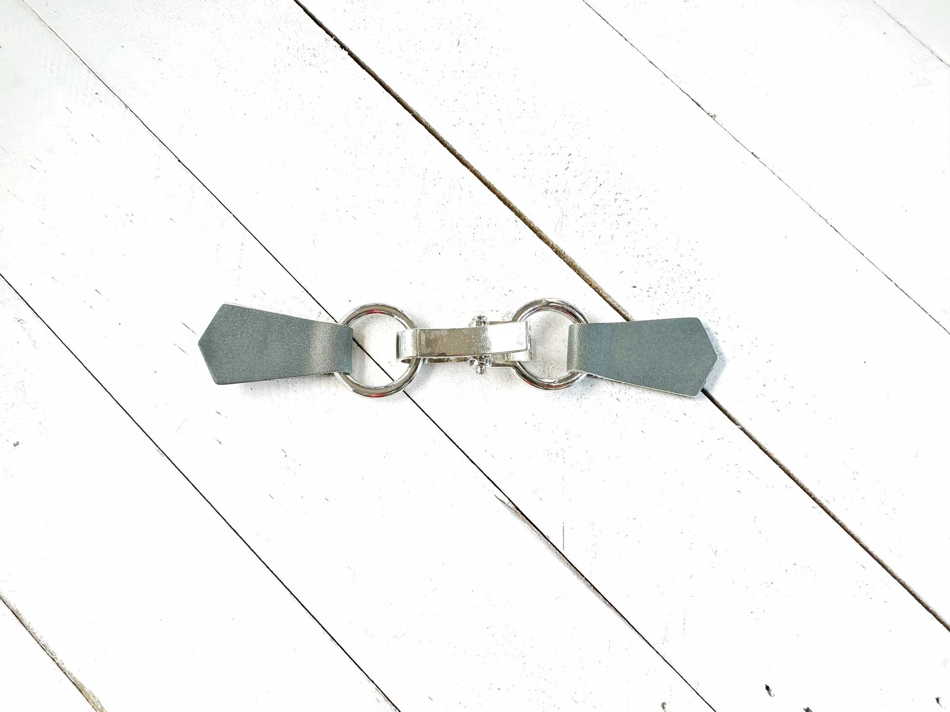 Silver buckle hardware with easy open/close & gray-green leather tabs on either side with grip clips hidden on back.