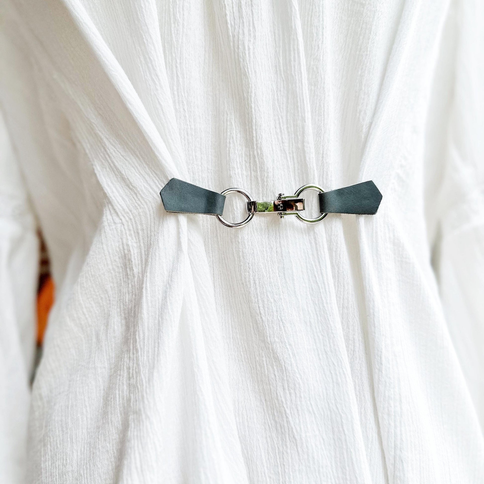 NEW Silver Buckle & Gray Leather Cinch Clip, Skinny Belt Alternative for Dress, Jacket, Cardigan, Mini-Tailor Button Closure, KardiKlips