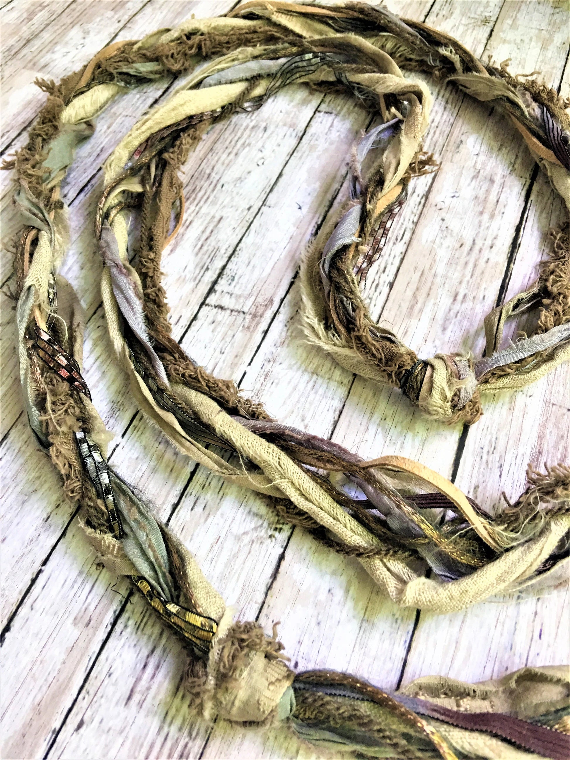 "Shoreline" is a subtle and intriguing combination of organic cotton in shades of khaki brown paired with sandy linen, nutmeg-colored mulberry silk and genuine suede leather, all intertwined with shimmering sandstone lattice ribbon, and delicate strands of bronze.