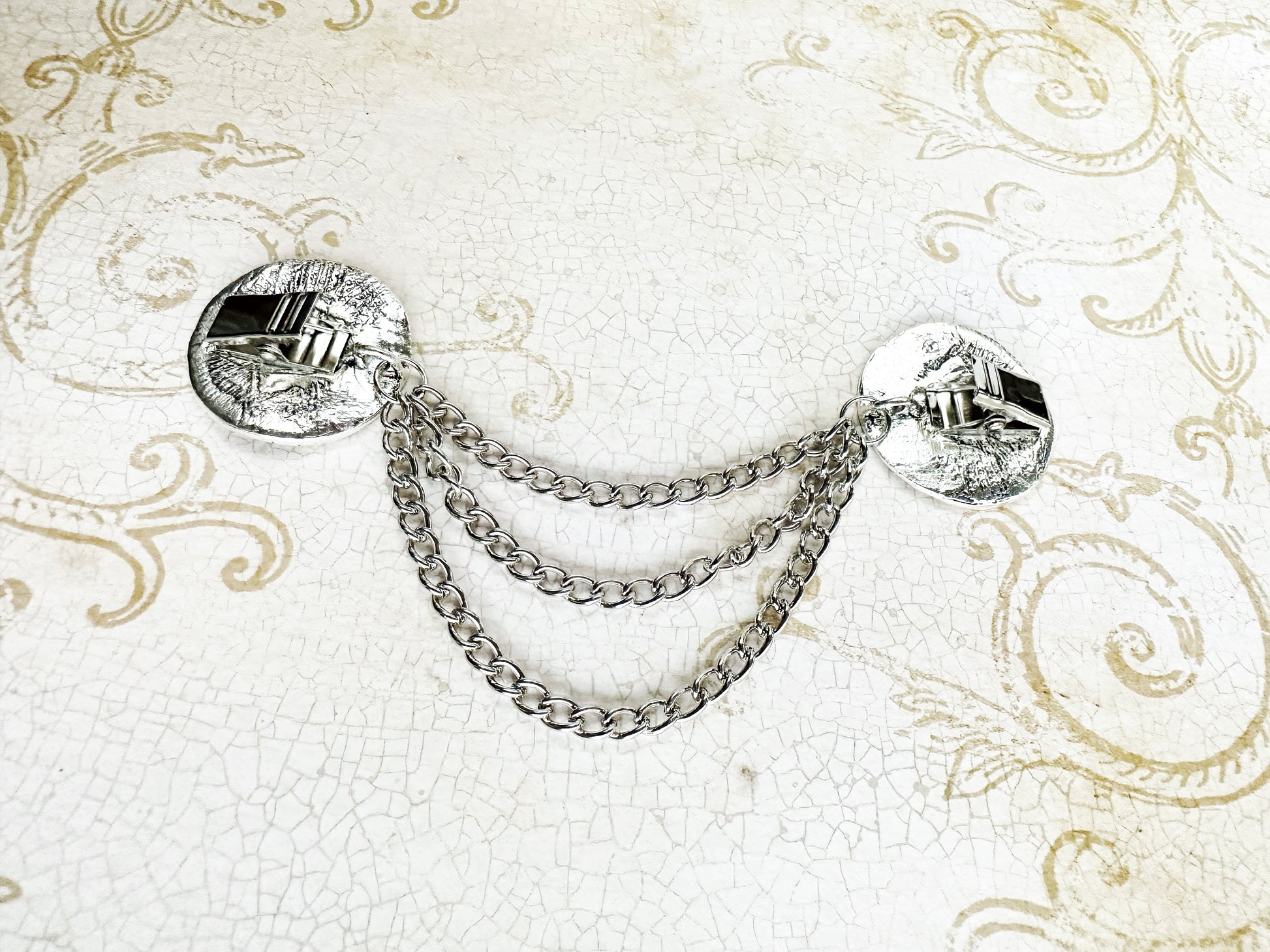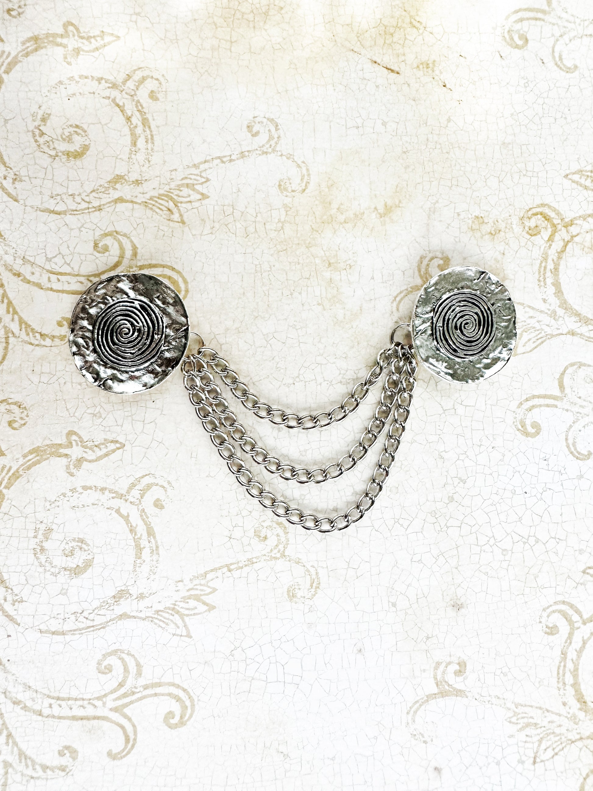 Featuring two hammered discs with a center spiral pattern connected by 3 draping stainless steel, diamond-cut curb chains, these medallions are easy to fasten and provide a secure attachment to your cloak or costume.